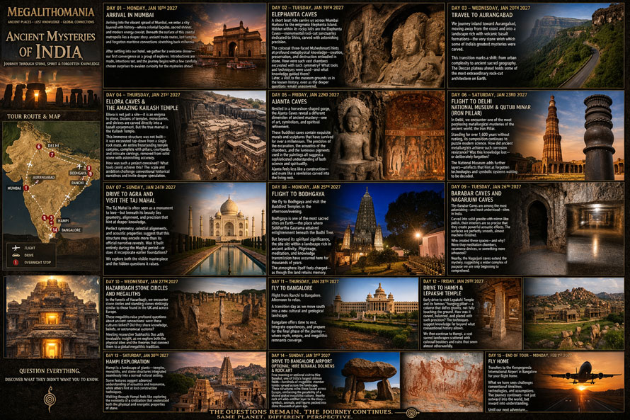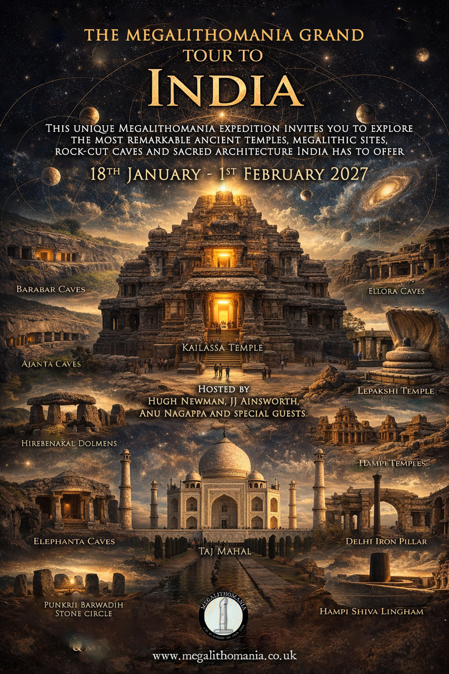 TO ANCIENT INDIA January 18th - February 1st 2027 Hosted by Hugh Newman, JJ Ainsworth and Anu Nagappa with special guests from India joining us on specific days This unique Megalithomania expedition invites you to explore the most remarkable ancient temples, megalithic sites, rock-cut caves and sacred architecture India has to offer