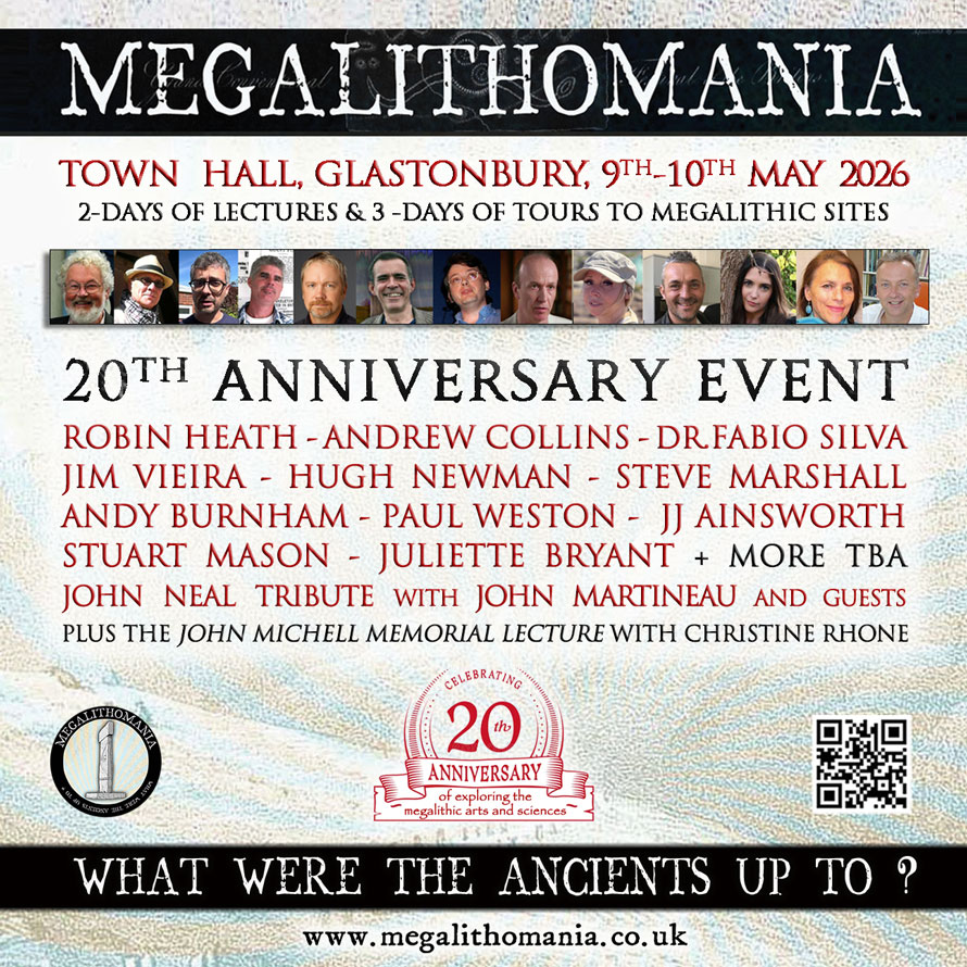 Hello Megalithomaniacs. We look forward to seeing you all once again in 2026 with our anniversary of 20 years of exploring the megalithic arts and sciences. We have some very special guests speakers lined-up and we will be giving a special tribute to the worlds number one ancient metrologist, John Neal who passed away in August. We wil also look back over the years how 'Nosher' and his good pal John Michell influenced a generation.