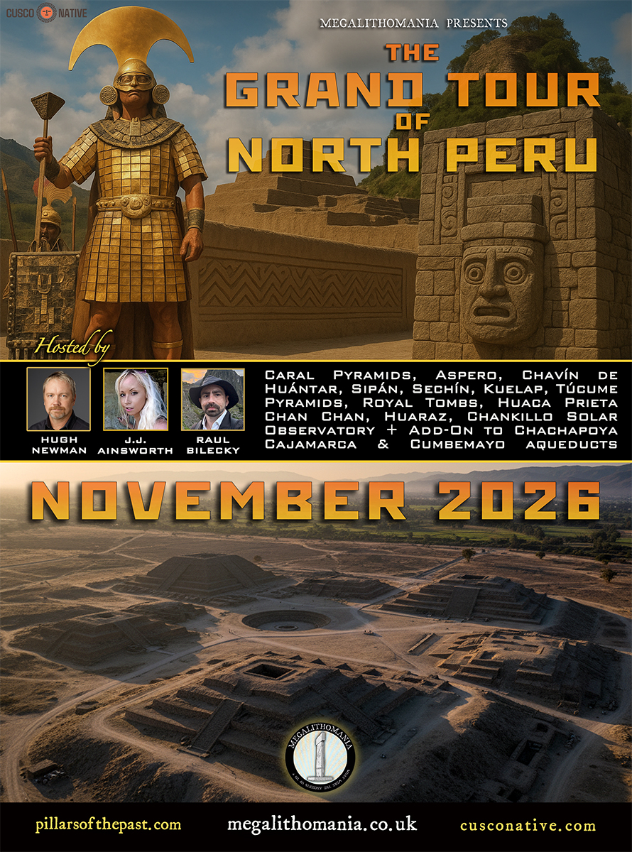 | Megalithomania presents Full details, itinerary and booking here ![]() Join Hugh Newman of Megalithomania, renowned explorer Raul Bilecky of Pillars of the Past, and symbolist JJ Ainsworth for a remarkable journey uncovering the hidden wonders of Northern Peru's ancient civilizations. This tour offers a deep dive into the mysteries of this remarkable area of Peru, but exoploring sites often ignored by other tours. The trip includes the ancient Caral Pyramids, Chavín de Huántar, Sipán, Sechín, Túcume Pyramids, Royal Tombs Museum, Huaca Prieta, Chan Chan, Huaraz Museum, Enlongated Skulls, Chankillo Solar Observatory + an Add-On to Cajamarca, Cumumbemayo aqueducts, Kuelap, and Chachapoyas,. We will visit sites that are off the beaten path and on private property -, a speciality of Raul and his intrepid explorations over the last few years. Click on the link below to see a full lenghth interview covering some of his remarkable discoveries. Book here.